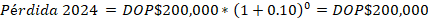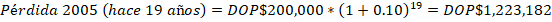 Sumar simplemente los DOP$200,000 año tras año desde el 2005 hasta el 2024 no tiene sentido económico, ya que mezcla pesos de diferente poder adquisitivo por la incidencia del valor del dinero en el tiempo. Lo correcto en este caso es calcular el Valor Futuro (VF) de cada ganancia anual perdida, capitalizándola hasta el 2024, para esto usamos una tasa de actualización del 10% anual.